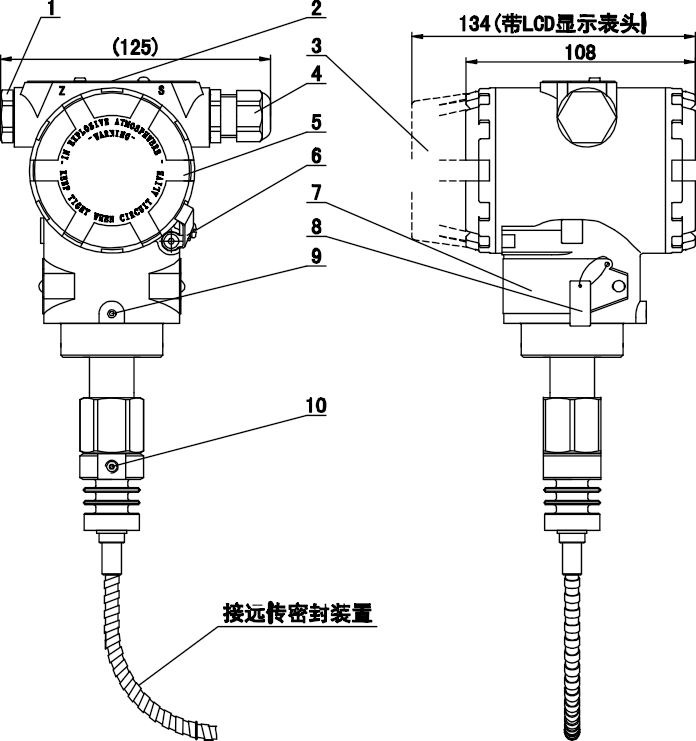 1. 電氣密封悶頭 2. 就地按鈕(蓋板下) 3. 電子部件側(cè)表蓋 4.電氣接口:M20×1.5 電纜密封頭 5. 接線端表蓋 6. 表蓋安全固定扣(防爆) 7. 銘牌 8. 懸掛式位號牌(選件) 9. 電子外殼旋轉(zhuǎn)定位鏍釘 10. 遠傳充灌密封口 |