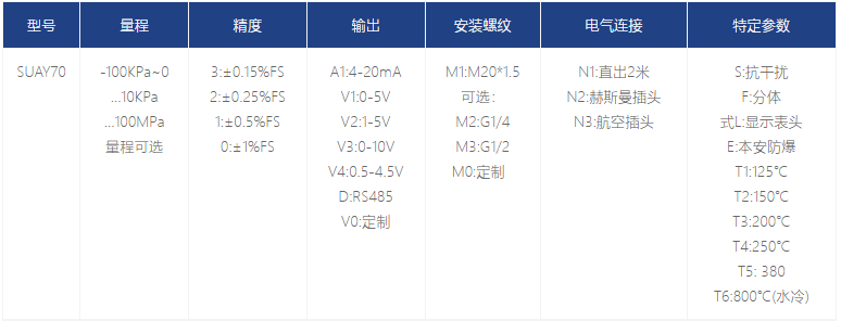 SUAY70 高溫壓力變送器采用耐高溫的硅-藍寶石技術的感壓膜片作為核心,匹配特殊的溫度補償和片上線性修正技術,使其在寬泛的溫區內有著良好 的綜合性能。藍寶石材料對溫度變化極不敏感,可在-40 至380℃的高溫下,也有著ji佳的彈性力敏特性,不會產生疲勞、滯后、PN 節漂移等現象,并且抗輻射性能優異。耐磨損,抗疲勞的鈦合金感壓膜片,使該系列產品不僅可以承受高溫,更兼具良好的耐用性、抗沖擊性。利用β相高溫力敏材料與合理的結構設計,可將溫度擴展至 450-850℃。